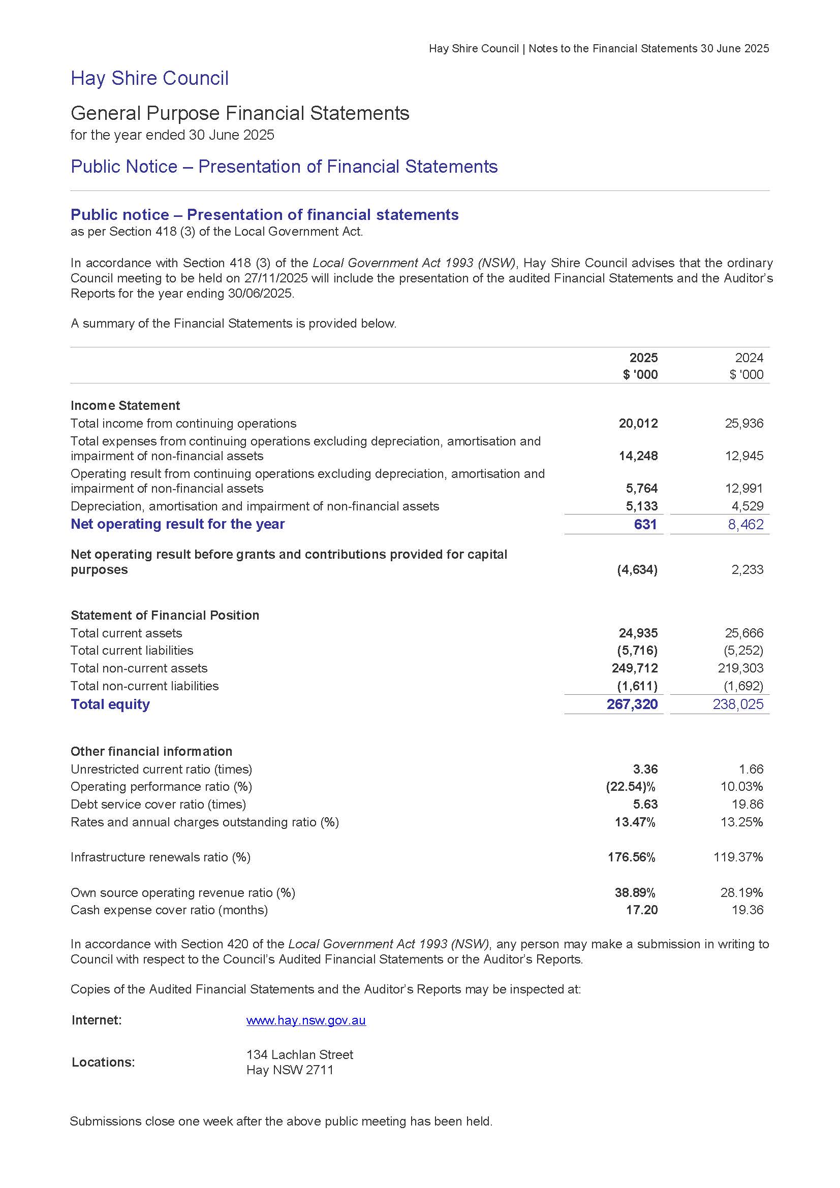 Public Notice – Presentation of financial statements Wednesday, November 5, 2025 / Categories: Council News Documents to download Hay Shire Council Annual Financial Statements 2025.pdf Download