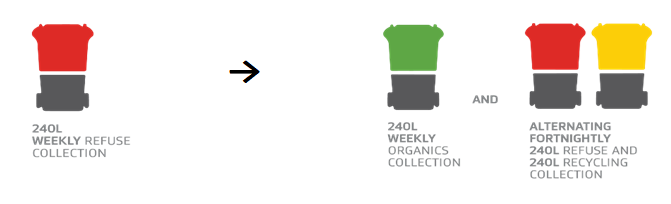 • WEEKLY collection of 240L organics bin (food organics and garden organics) - Green lid • FORTNIGHTLY collection of 240L recycling bin – Yellow lid • FORTNIGHTLY collection of 240L general waste bin – Red lid The Red and Yellow lid bins operate on an alternate week cycle, as per the 2025 Collection Calendar