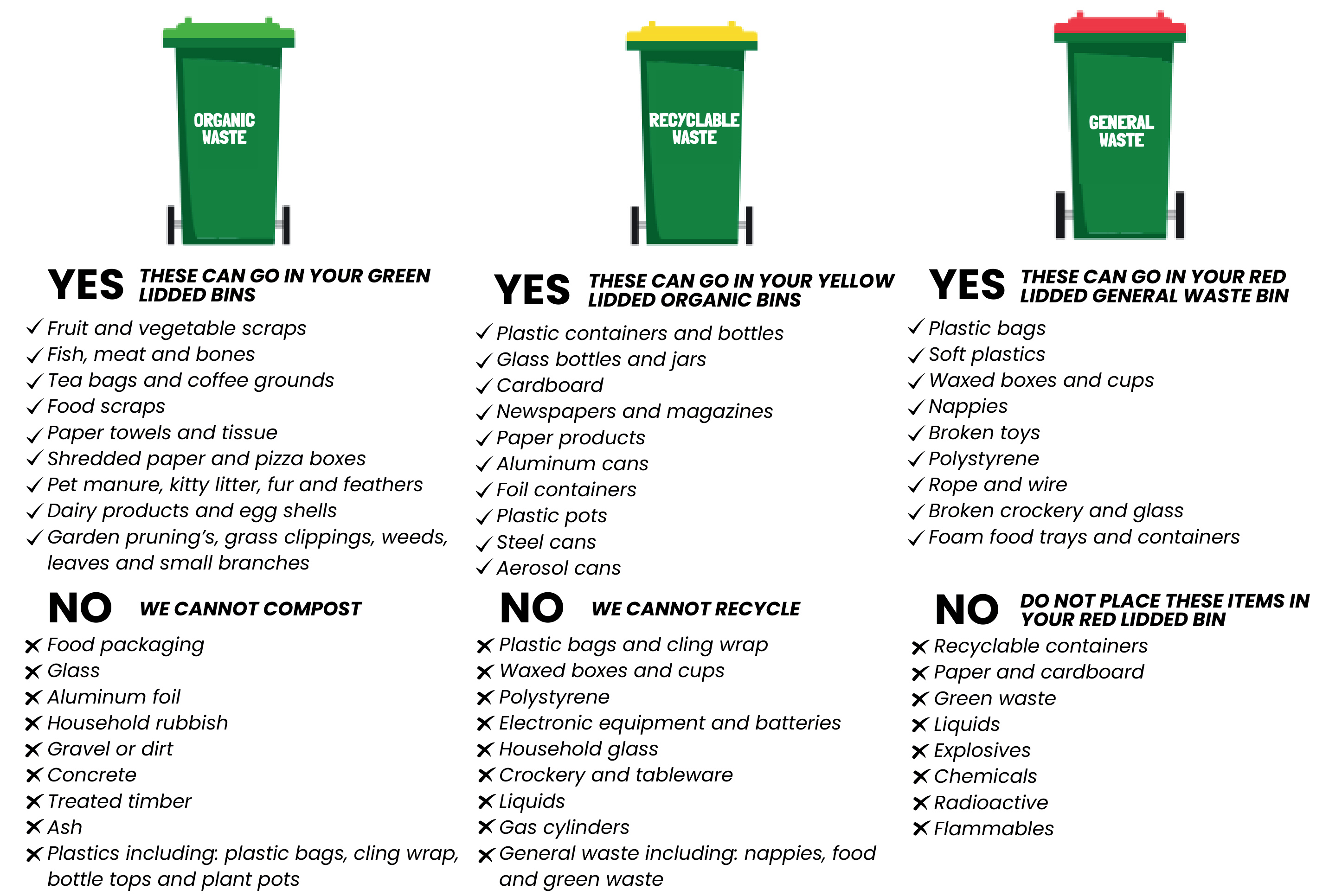 Many items can be recycled or turned into compost and most importantly, kept out of landfill. To help you make the most of the 3-bin system, refer to the handy lists below for which bin to use;