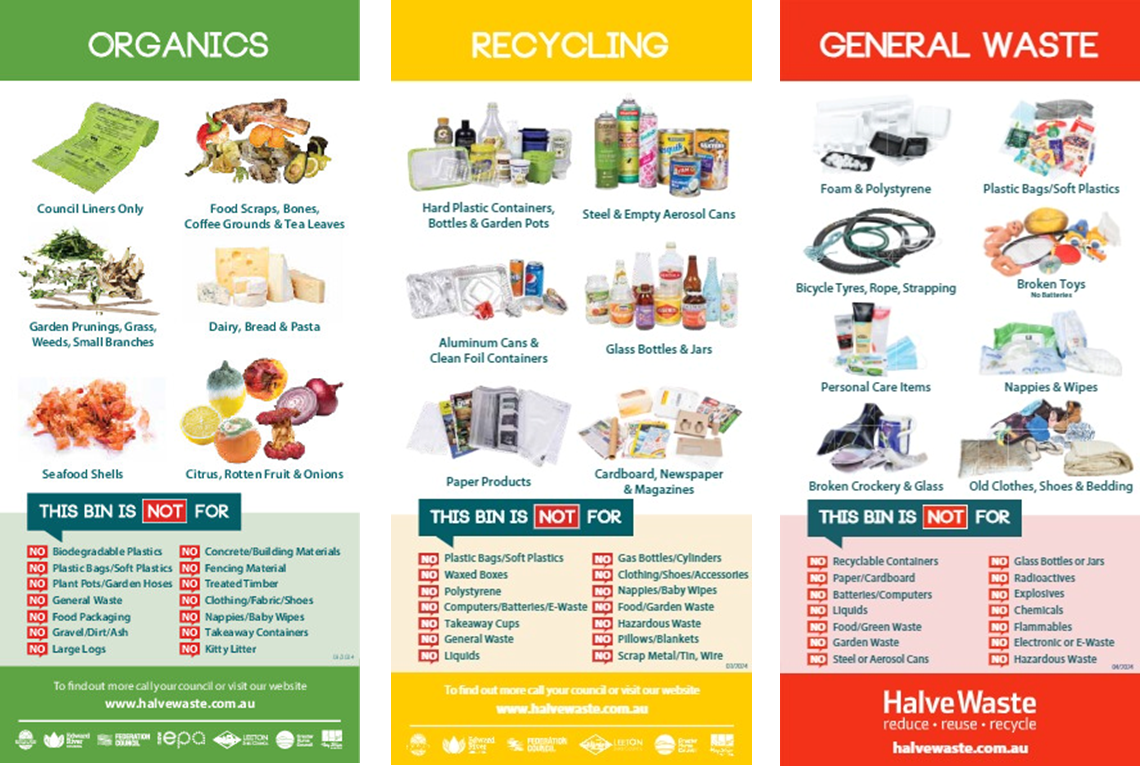 In July 2024 Hay Shire Council launched the 3 bin kerbside recycling collection to divert organics away from landfill. The new “3 bin” system allows food and garden waste to be collected from households. Households will have three separate 240-litre bins, with organics collected weekly, and recycling and general waste collected fortnightly.